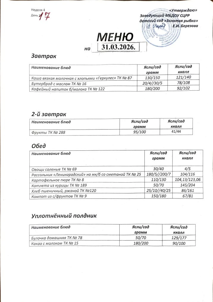 МБДОУ СЦРР детский сад «Золотая рыбка» обеспечивает воспитанников сбалансированным 4-разовым питанием, необходимым для нормального роста и развития.